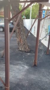 OcasionPlus de Las Rozas de Madrid había realizado un asfaltado en una parcela dejando la base de un tronco, de un buen ejemplar de pino piñonero, totalmente asfaltada.